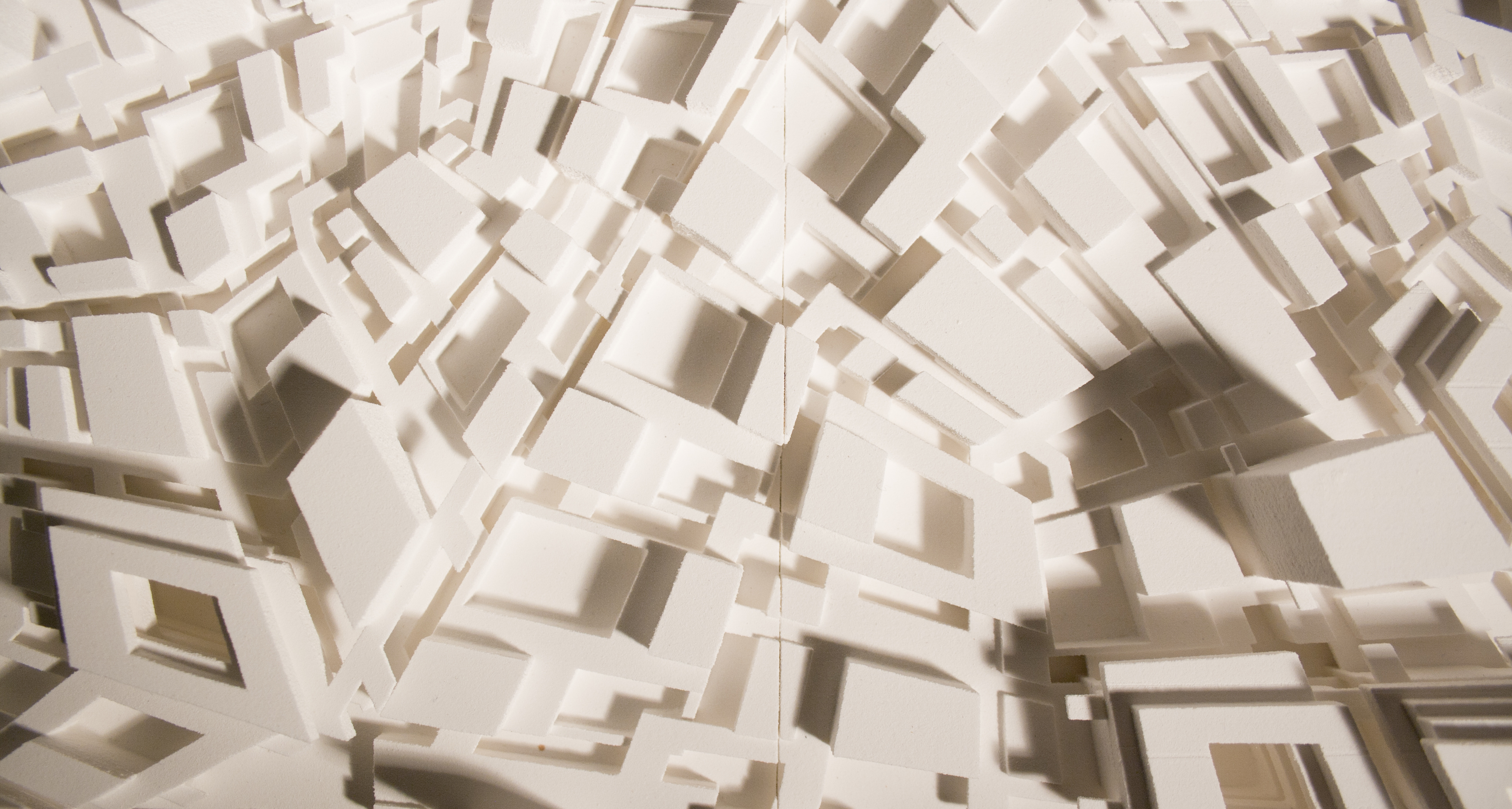 The printed model of the Final Dissertation entitled "Autonomous Infrastructures" representing a complete 1/1000 scale urban patch with central nucleus and processing plant.