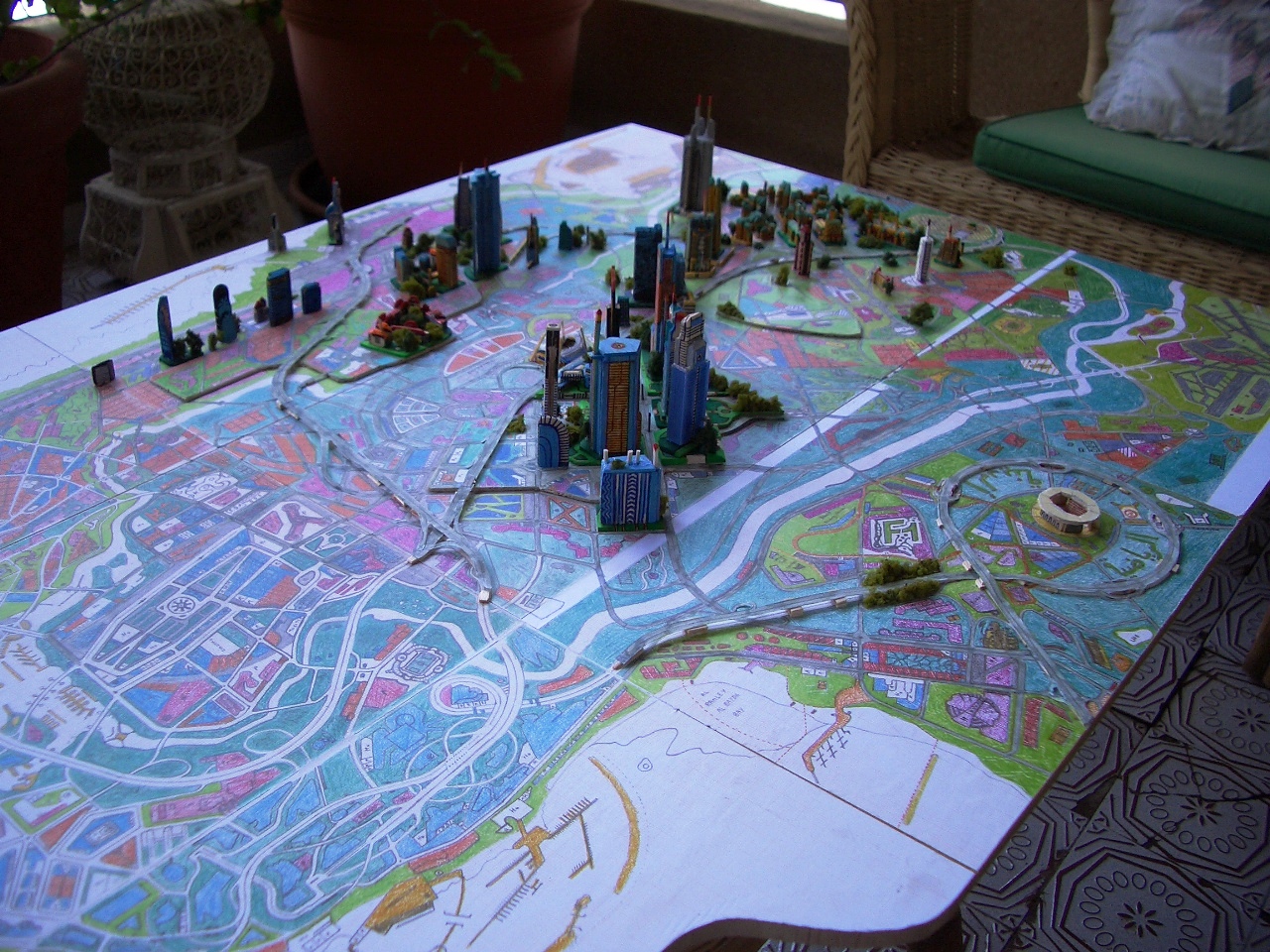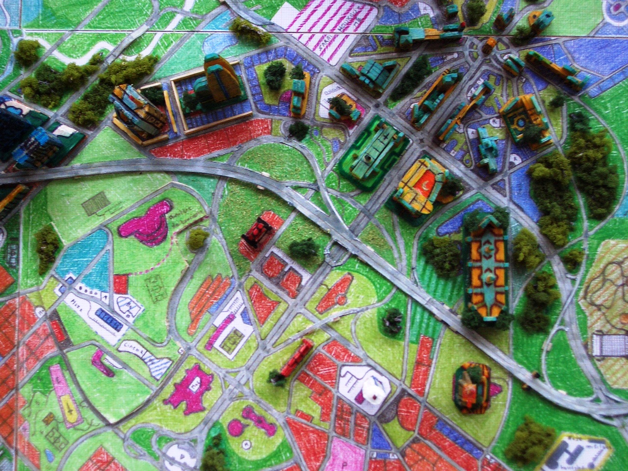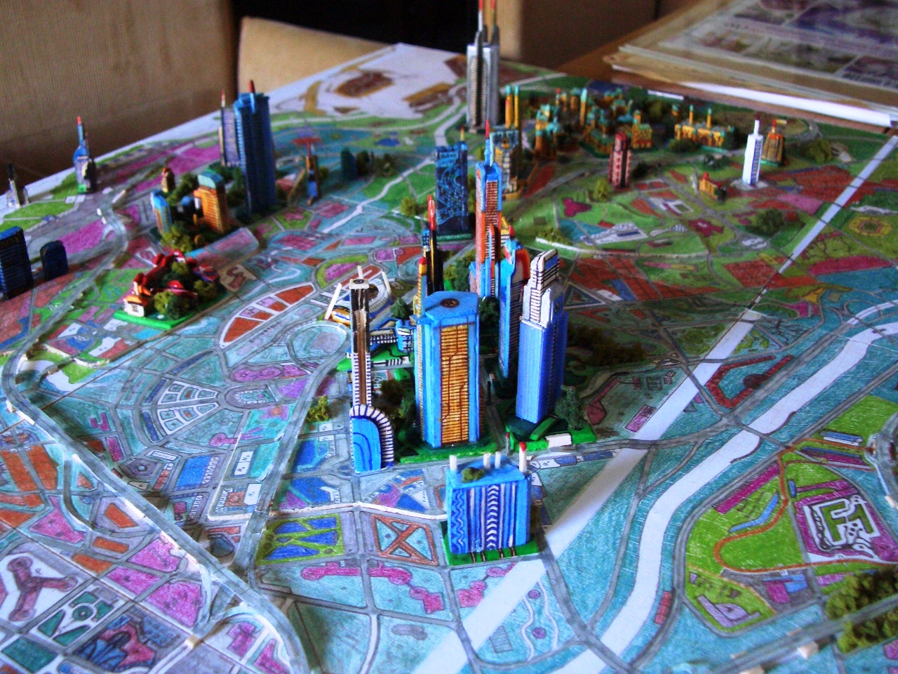Beirut Utopia is Chehab's project for his last year of school. The project is a re-imagined Beirut, capital of Lebanon, and consists of planning the city from scratch and redesigning its urban zones, roads, parks and highways in a complete top-to-bottom way. The project features a 1m x 0.8m cutout piece of wood over which he obsessively drew the vehicular axioms, then assigned various urban zones and building footprints (blue: commercial - red: residential - brown: industrial - purple: administrative / governmental / civic - yellow: religious - orange: marine - grey: non-built - green: landscaping - etc...). After creating the plan of the fictional capital, he designed and made each building from cutting, polishing and coloring small pieces of balsa wood.