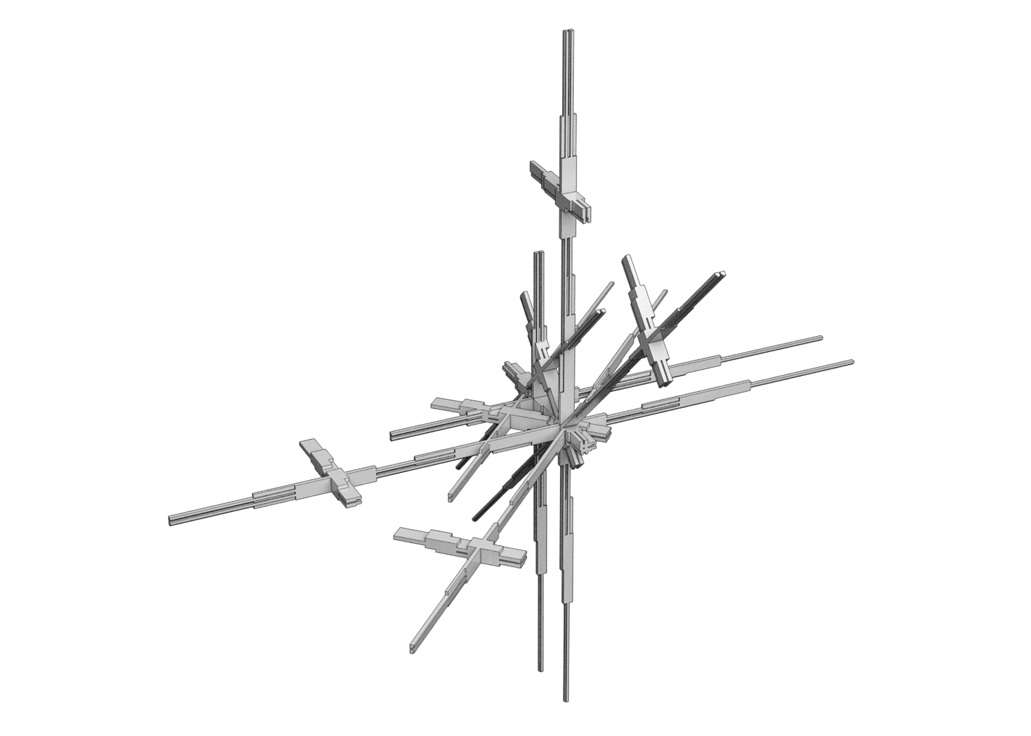 The second part of the pseudo-code is the main engine for the growth of the body rather its constituents. It derives from the iterative process and perpetual feedback between growth and self-evaluation, and constitutes therefore the evolutionary approach of the sequence. This part incorporates the first part for the development of individuals, however its use comes from the fact that it is structured in a way to judge whether the growth of the body from the multiplication of individuals should continue towards an overall compact form or to switch if needed to for a less compact and a more spiky shape in certain areas. The latter is achieved by using an if/else statement inside the loop of the iterative engine such as, at the end of each multiplication phase, the body evaluates itself and outputs a numerical value representing its new ratio to influence the outcome of the multiplication process. The multiplication phase is not a simple array of the individual; it consists of copying the individual and relocating its copy to the farthest point of the original. All in all, this second part of the pseudo-code allows for more control over the overall growth of the body, and as the body develops, it provides more differentiation in the body parts.