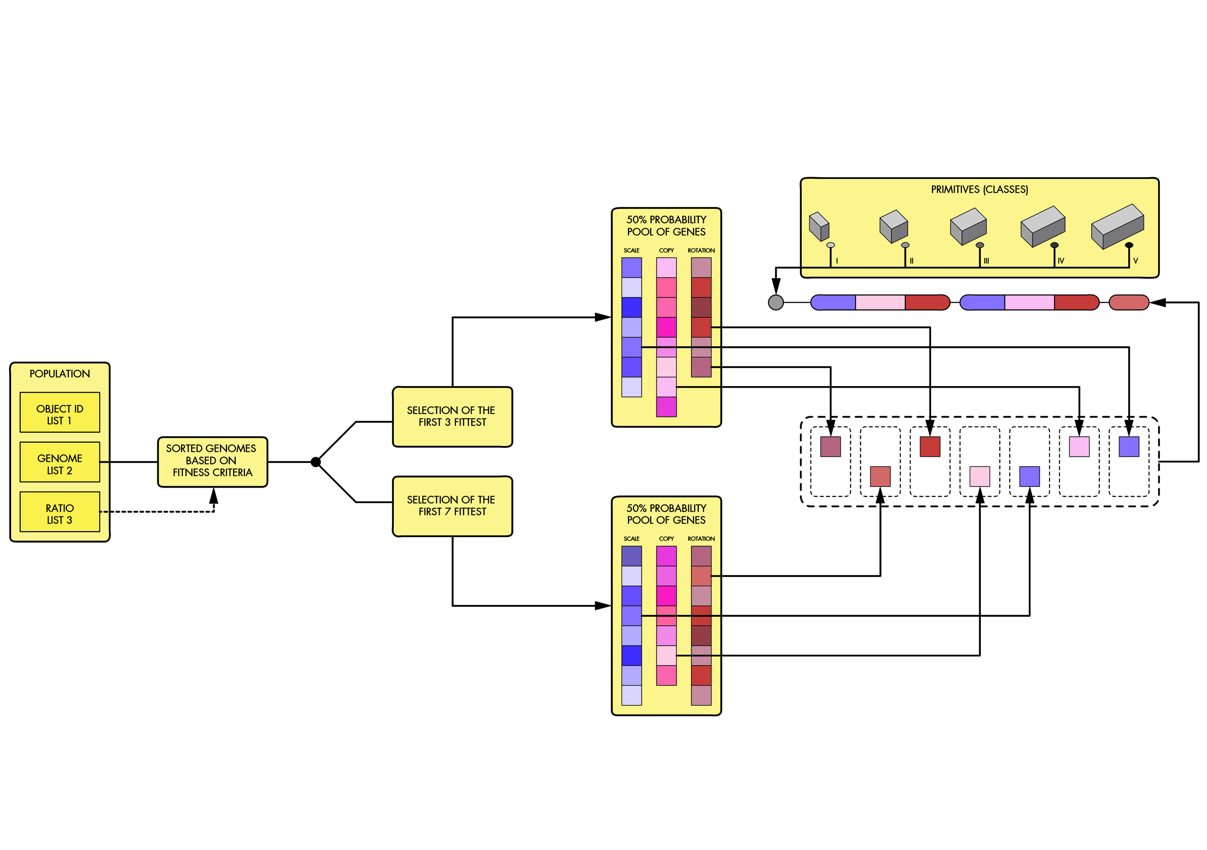 A primary list with all the individuals of a population is first placed into the sequence as data containing multiple layers of written information. What follows is the creation of nested data such as the object identification number, its genome and the ratio associated with it. This allows sorting the main list according to the nested information, and to extract the individuals that score for the lowest fitness ratio (favorable) of object volume to bounding box volume. These fittest individual are then bred to produce a new generation. Again, the fittest ones (the ones with the lowest numerical ratio) are chosen. The selected individuals have their genomes analyzed and compared. After iterating the process 3 times, we note the following: